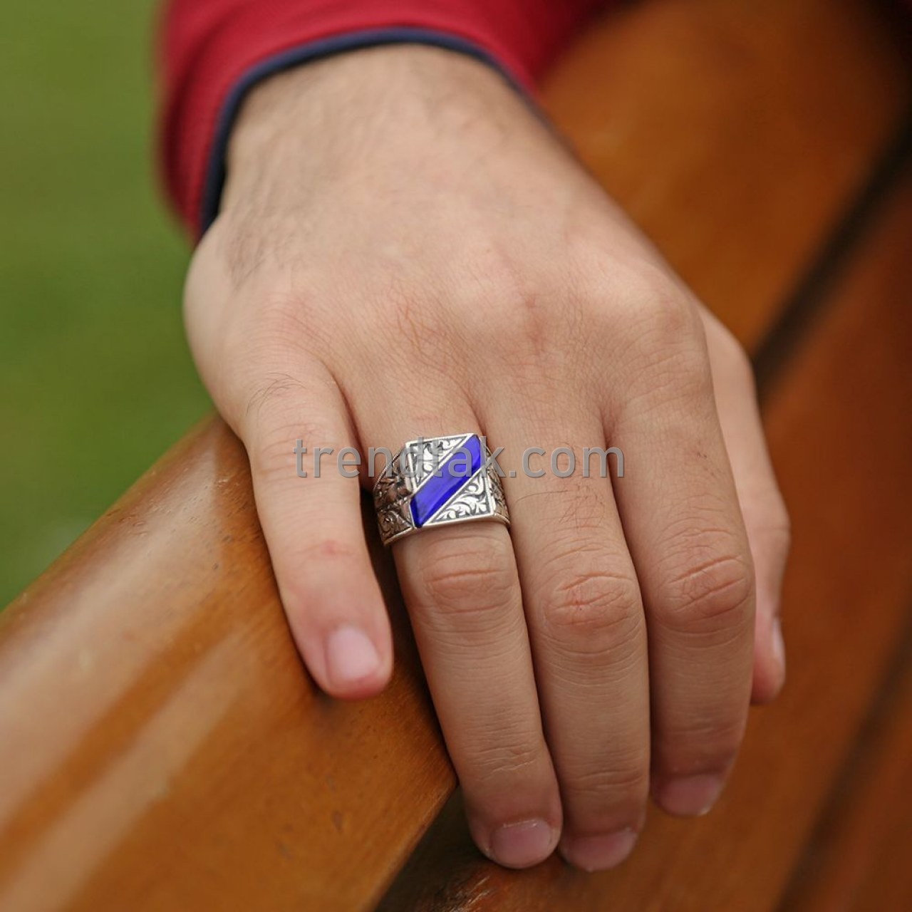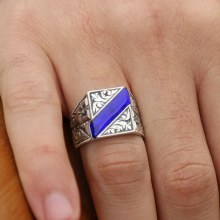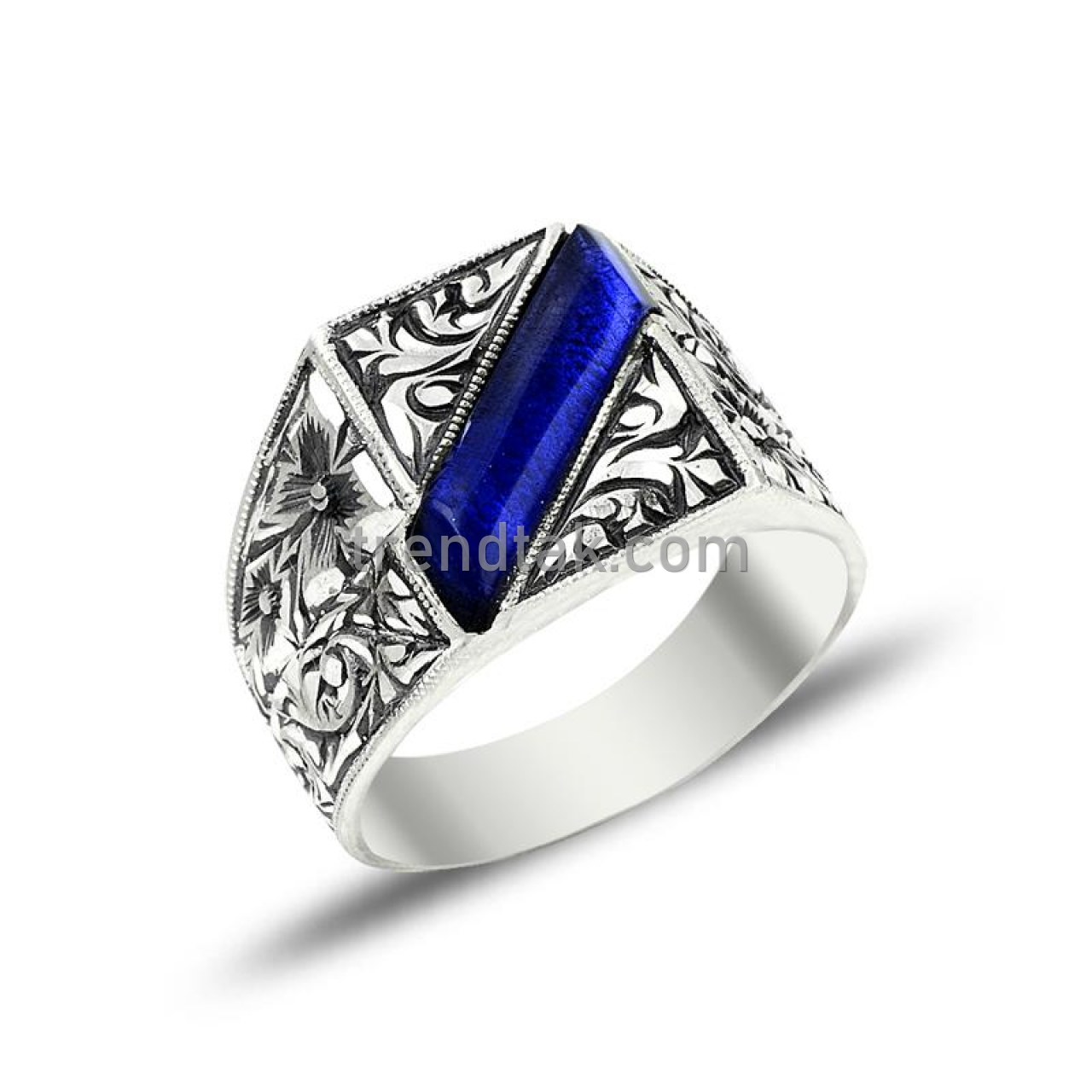 Taş : Yanları el kalemi ile işlenmiş mavi mineli yüzük