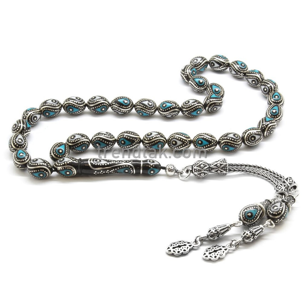 Trendtak Gümüş Firuze Mine İşlemeli Oltu Taşı Tesbih