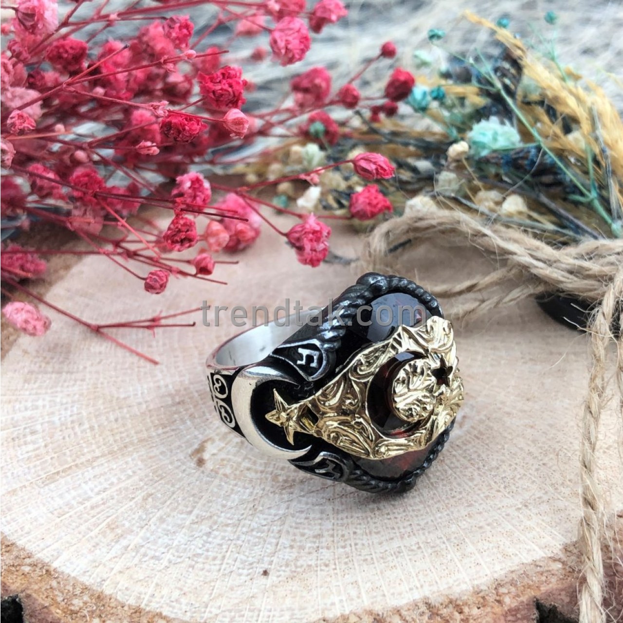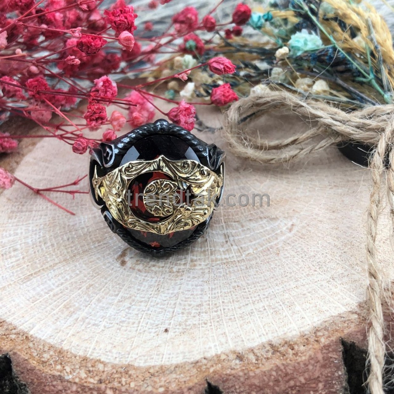 Trendtak Kırmızı Granat Ay Yıldız Gümüş Erkek Yüzük